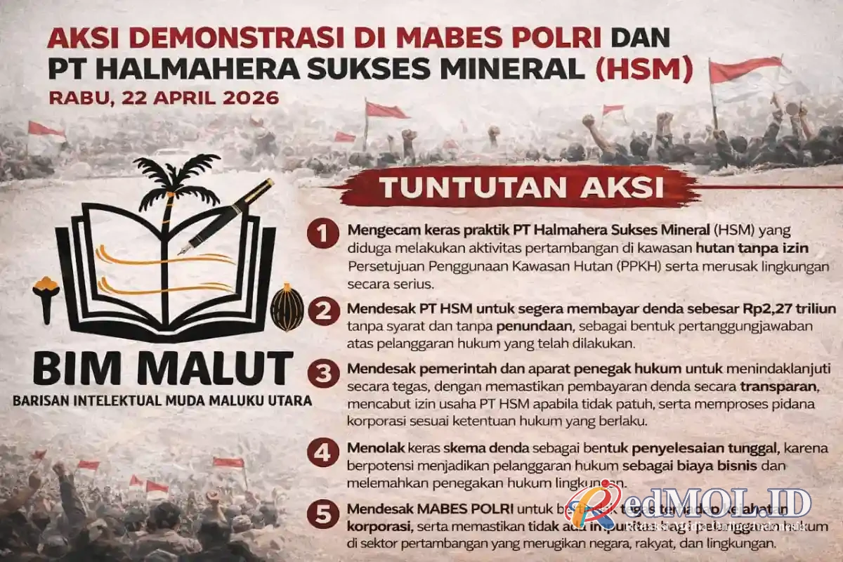 Malut, REDMOL.id – Barisan Intelektual Muda Maluku Utara (BIM-MALUT) memastikan akan menggelar aksi demonstrasi besar-besaran pada Rabu, 22 April 2026. Aksi ini merupakan bentuk tekanan terbuka terhadap dugaan praktik pertambangan ilegal yang dilakukan oleh PT Halmahera Sukses Mineral (HSM), sekaligus desakan keras kepada aparat penegak hukum agar tidak lagi bersikap pasif dalam menangani kasus kejahatan lingkungan berskala besar.